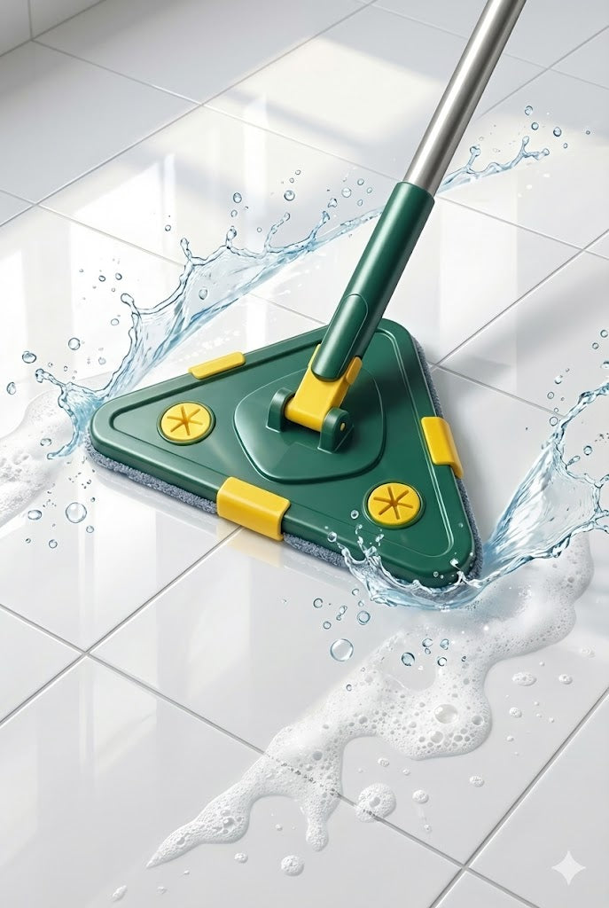 Üçgen tasarımlı mop, zor ulaşılan köşelere ve dar alanlara kolay erişim imkânı sunar. Islak mendil uyumlu başlığı sayesinde pratik kullanım sağlar. 360° dönebilen başlığı ile mobilyaların altına ve dar alanlara rahatça ulaşarak temizlikte maksimum hareket kabiliyeti sunar. Çek çekli başlığı sayesinde pürüzsüz cam temizliği de yapılabilir.
